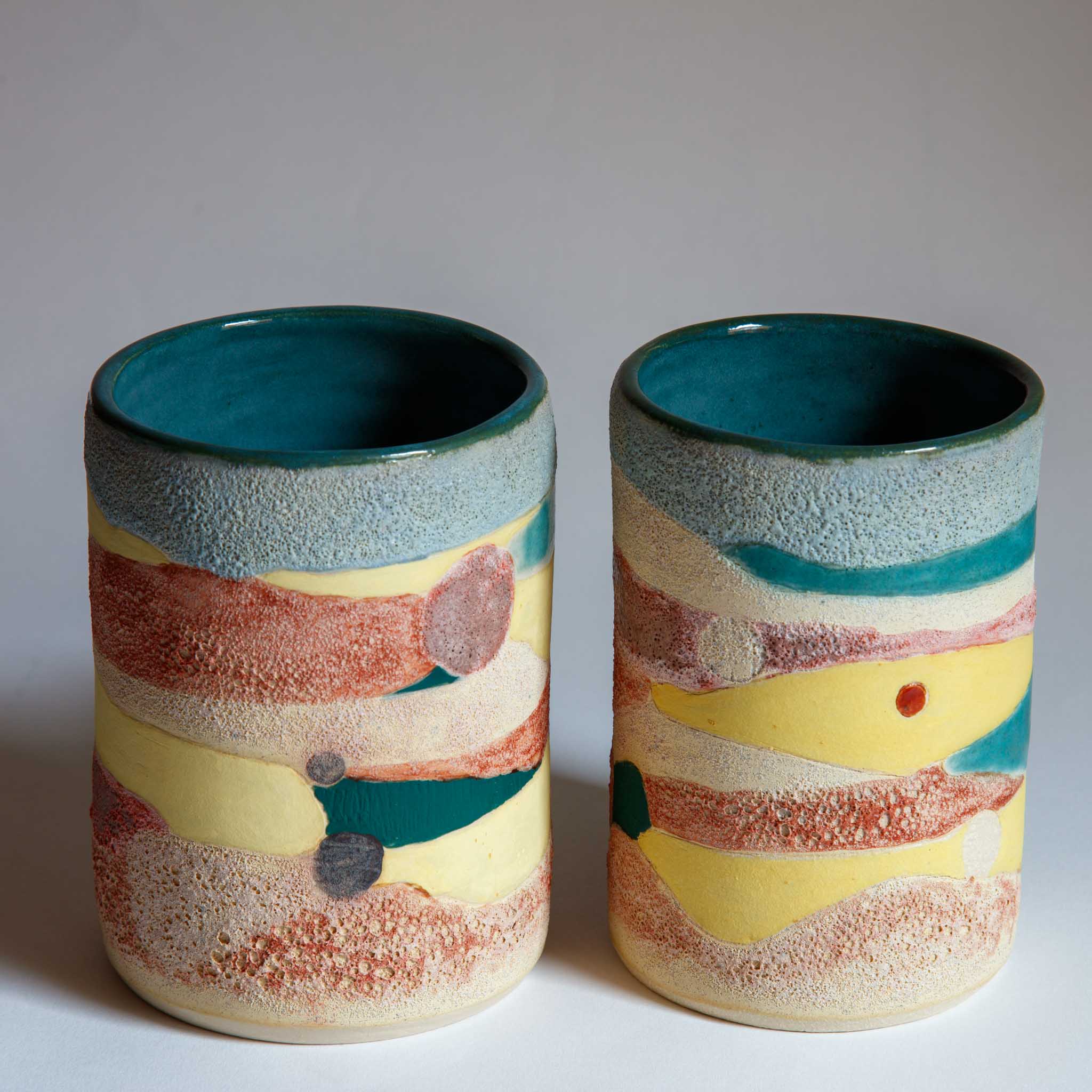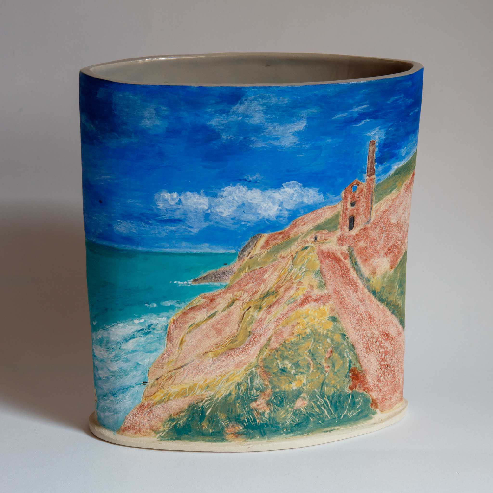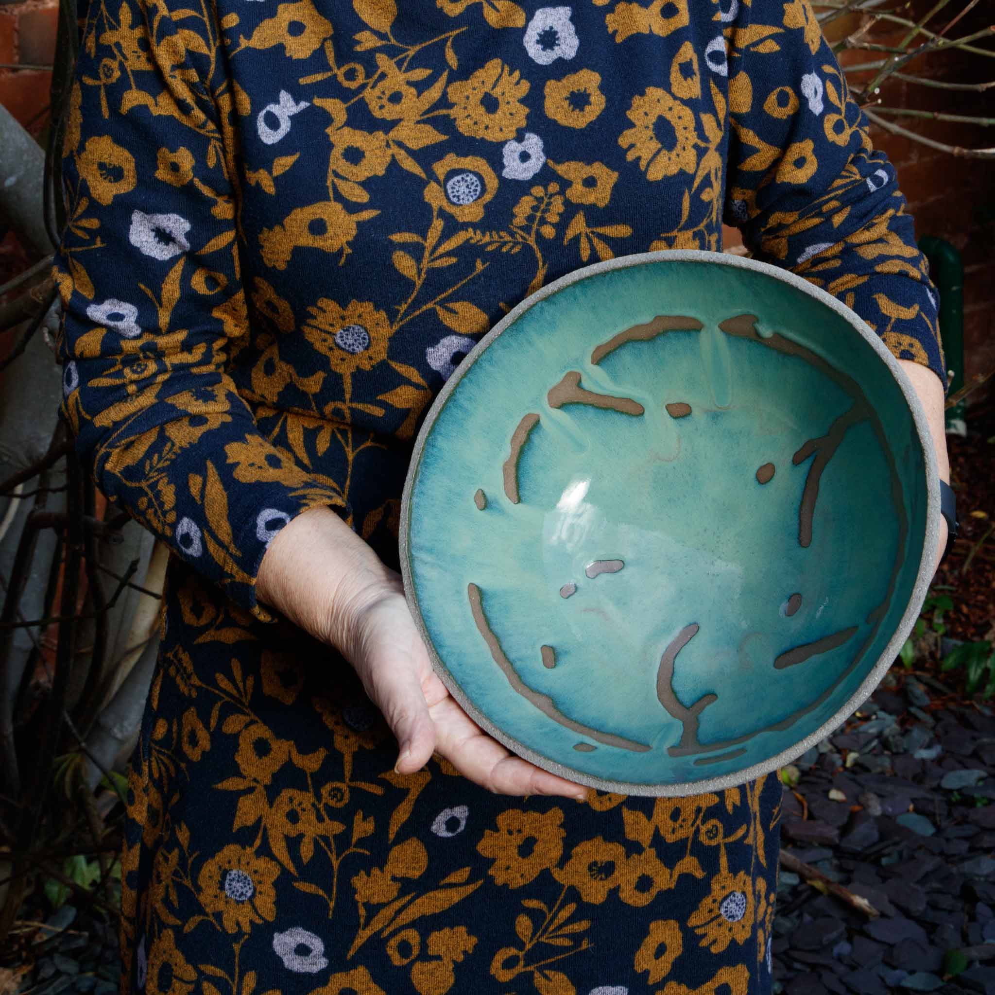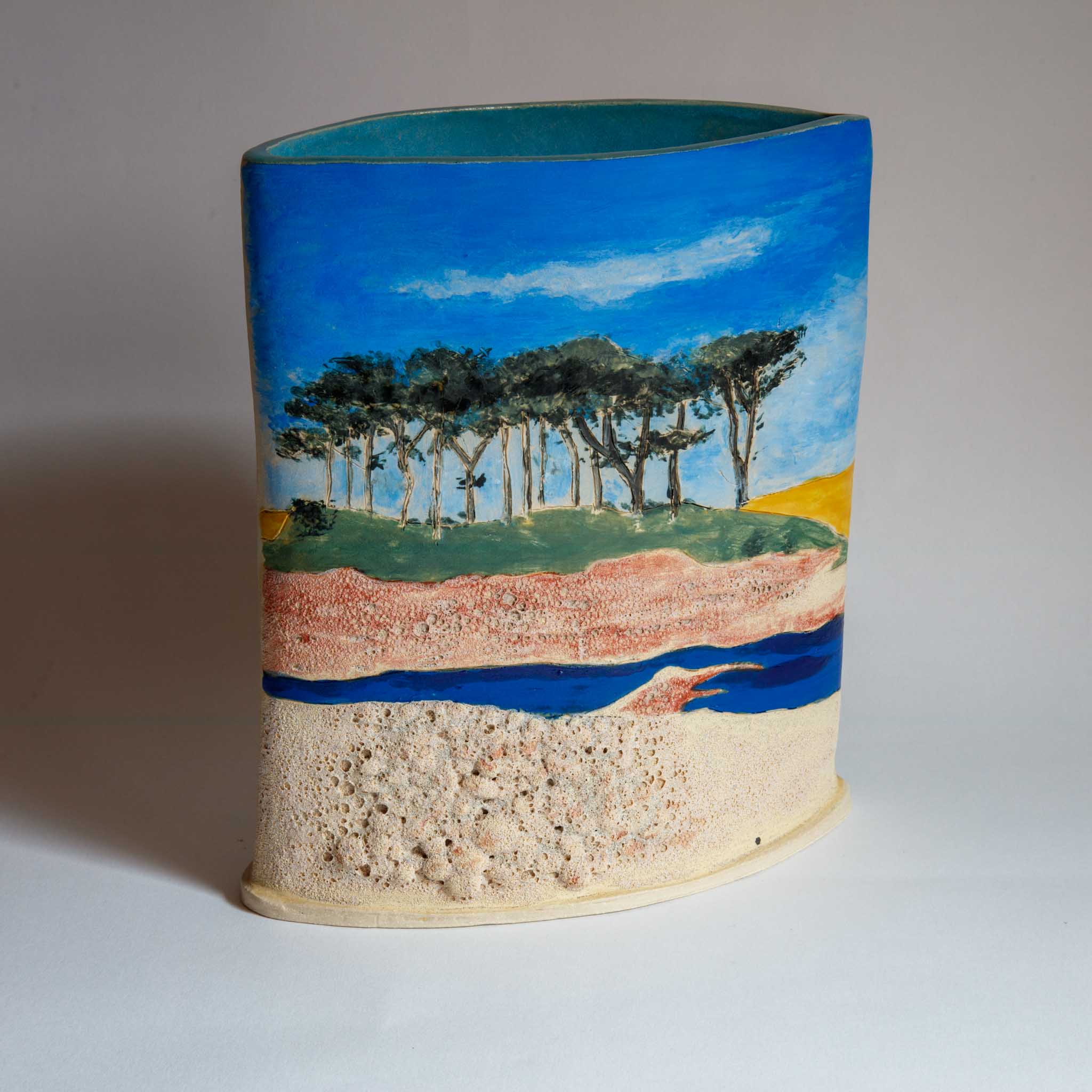 Working from my studio in Crediton I create contemporary ceramics using stoneware clays selected for their contrasting textures and the colours that emerge after firing. My aim is to create unique artistic pieces, to be loved and used. I initially worked mainly on the wheel, to which I often return, glazing these pieces in multiple layers to achieve exciting and often unpredictable outcomes. However, I often work with slabs from which I create pieces on which abstract designs obliquely or more obviously pick up on botanical influences. Typically, these are glazed in rich greens and blues with unglazed textured areas retained in the finished piece. Most recently I’ve been working on a series of Iconic Landscape Vessels inspired by the colours and striking features of our coastlines and landscapes in the southwest.