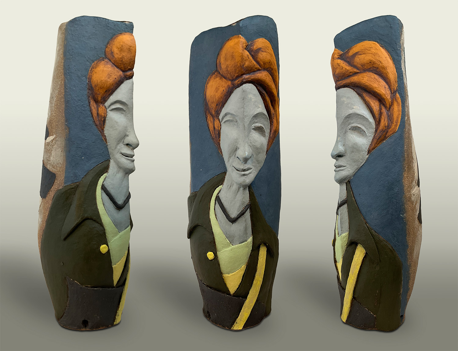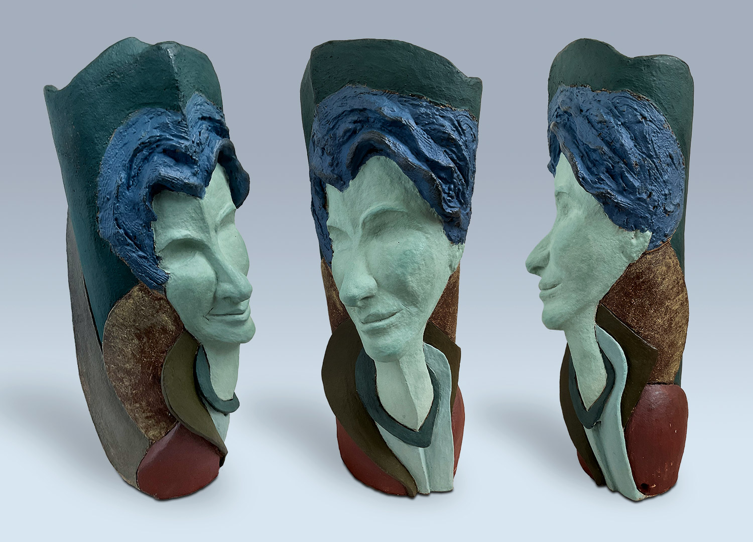 My environmentally-themed ceramic sculptures draw inspiration from gardening observations & my love of Nature’s natural forms. Having recently returned to Devon, I’ve become increasingly concerned by “climate changes” reducing our DAYLIGHT LEVELS. This problem was initially illustrated in my 12 oil paintings. These inspired my 5 “Messengers”, who are large colourful ceramic sculptures, over 500cms high.