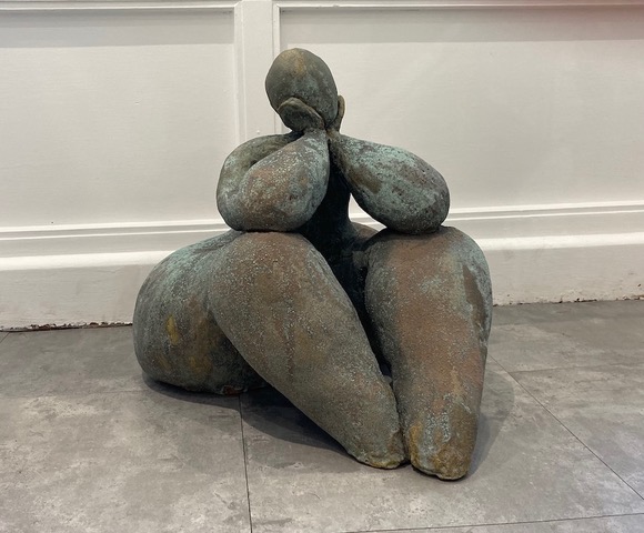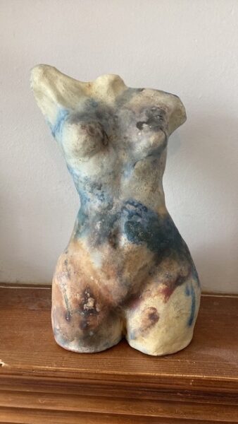 My sculptures are a deeply personal exploration of that balance between self love and self expression; and body dysmorphia and body confidence. I love the act of finding a person within the clay, and seeing the very nuanced and expressive capacity of the body, without the usual expressive indicators of hands and face. It amazes me that the simple human form, when made with raw intent, speaks to the viewer in their own way and using saggar firing or glazes created to evoke ancient statues allows the pieces to feel ageless. The organic and dynamic nature of saggar firing natural organics and combustibles and the tactile aged glazes imbues each piece with timeless presence and an intuitive link to the viewer.