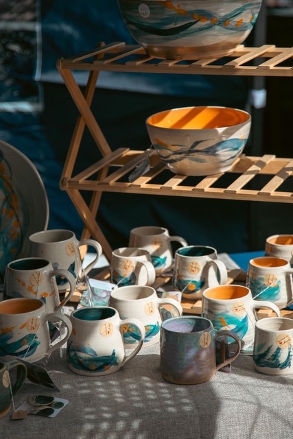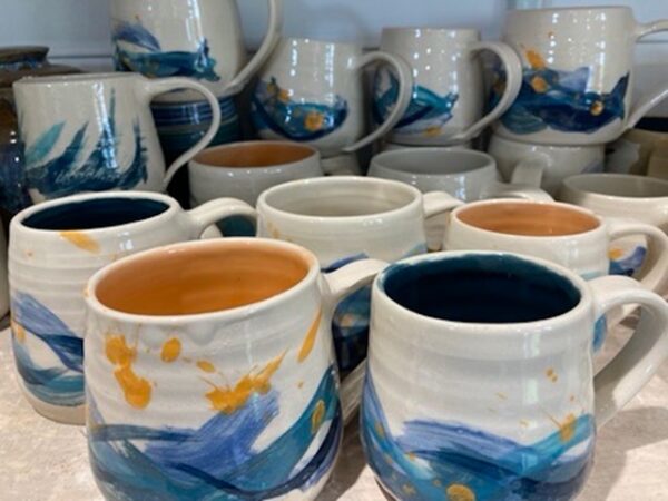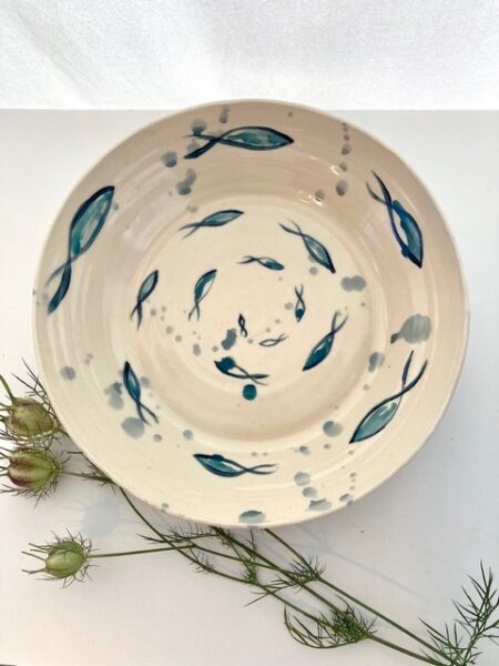 I create both functional and decorative pieces- wheel thrown and sculpted. My wheel thrown pots are functional and decorative stoneware, with form, glazes and brush work inspired by a life long love of nature, particularly the sea, which led to a record setting decade of channel swimming. I like to balance form and function- creating soft curves that hold the eye with bold graphic stroke work of slip and underglaze decoration that shares the joy of a wild and lumpy sea swim… or soft diffuse glaze work the mirrors the sea mists, or gentle rolling hills of my Somerset upbringing.