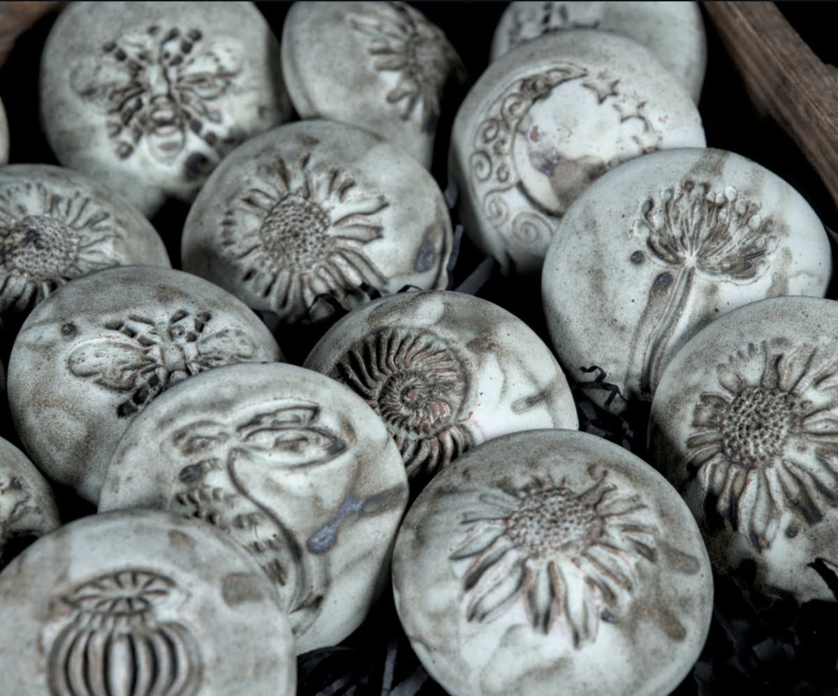 I handbuild using coils and slabs, forming textured earthenware and stoneware table lamps, sea urchin tealights, trinket and pocket empty dishes. I make whatever and go wherever my fancy takes me!