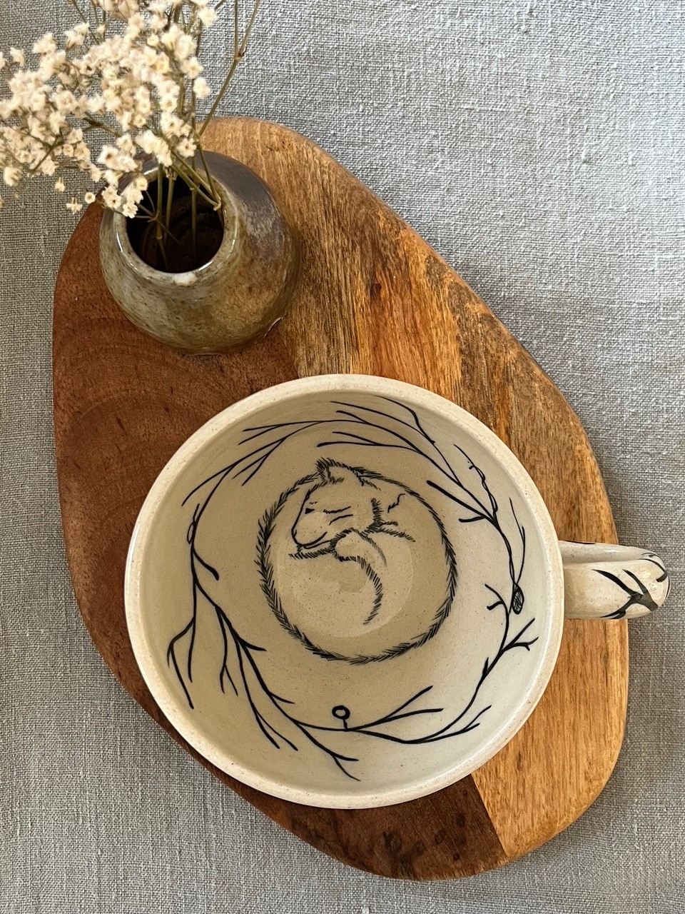 Elegant forms hand-painted in neutral tones, inspired by nature and folklore.