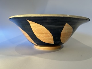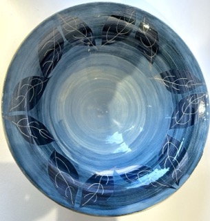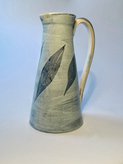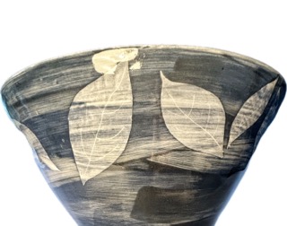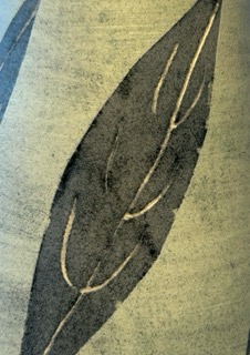 I work with earthenware clay using a wheel. For decoration I use slips and stains often with paper resist.