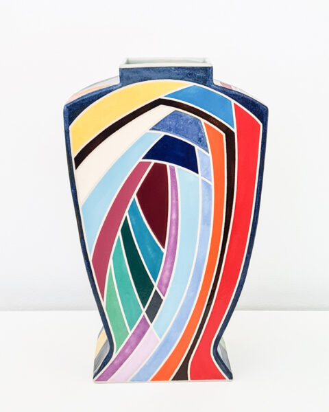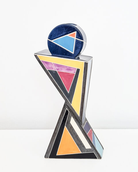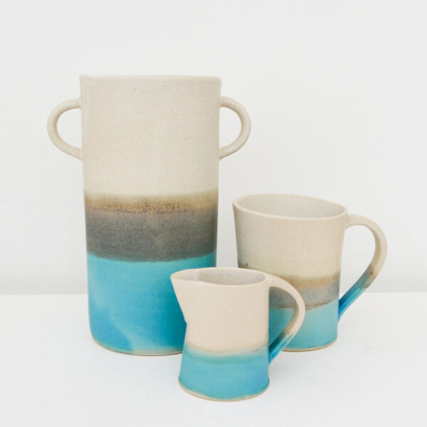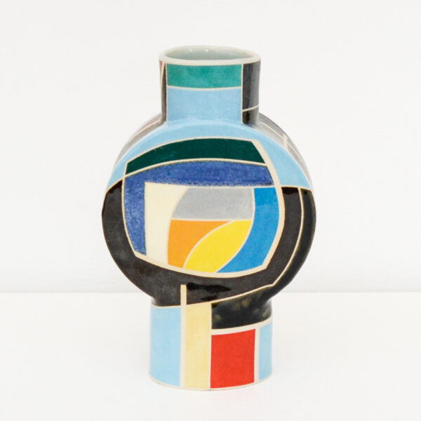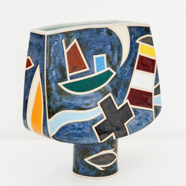 I make stoneware and porcelain pieces mainly slab- or hand-built and decorated with minimalistic designs. I am in awe of the endless possibilities in what I can create from a wet lump of clay. Contrasting colours and straight lines are a recurring theme softened by the organic fluidity of high firing glazes. Functionality, shape and how the finished piece feels in your hands is most important to me. Recently I am exploring more sculptural shapes with abstract designs.