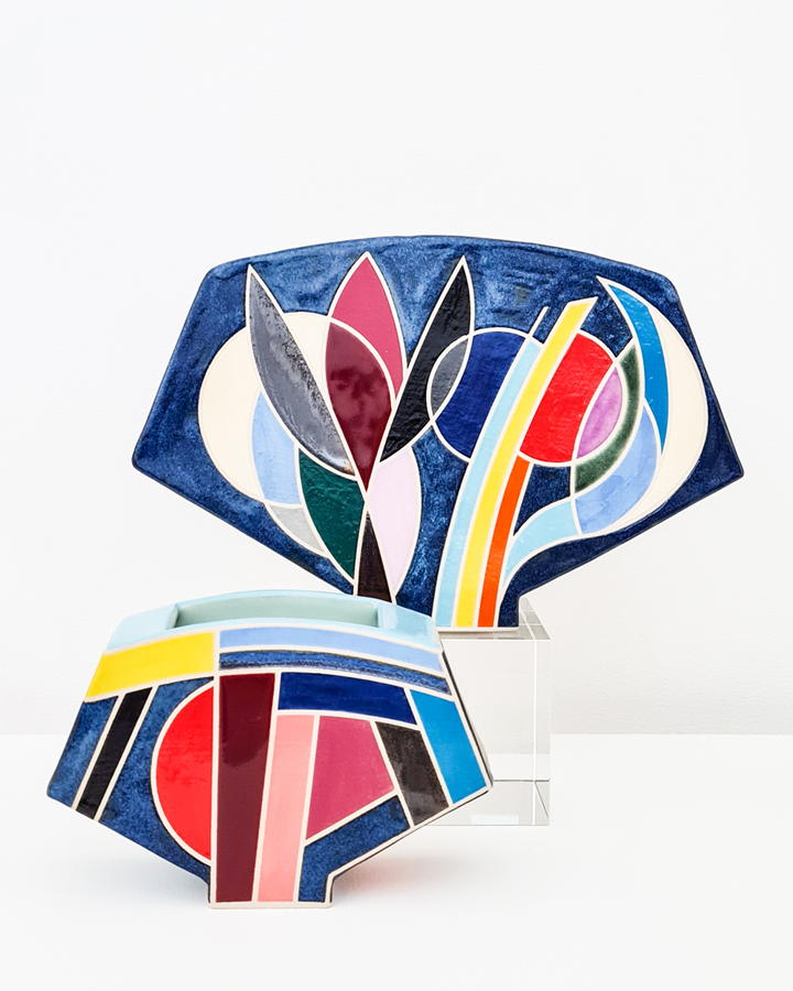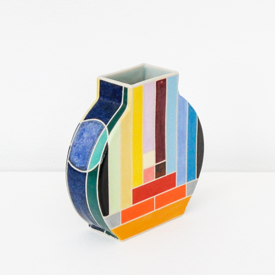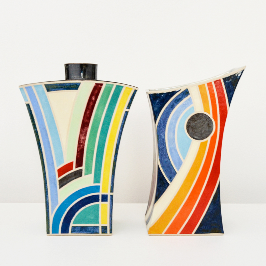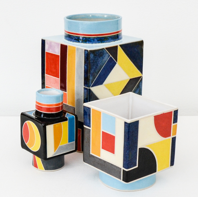 I make stoneware and porcelain pieces mainly slab- or hand-built and decorated with minimalistic designs. I am in awe of the endless possibilities in what I can create from a wet lump of clay. Contrasting colours and straight lines are a recurring theme softened by the organic fluidity of high firing glazes. Functionality, shape and how the finished piece feels in your hands is most important to me. Recently I am exploring more sculptural shapes with abstract designs.
