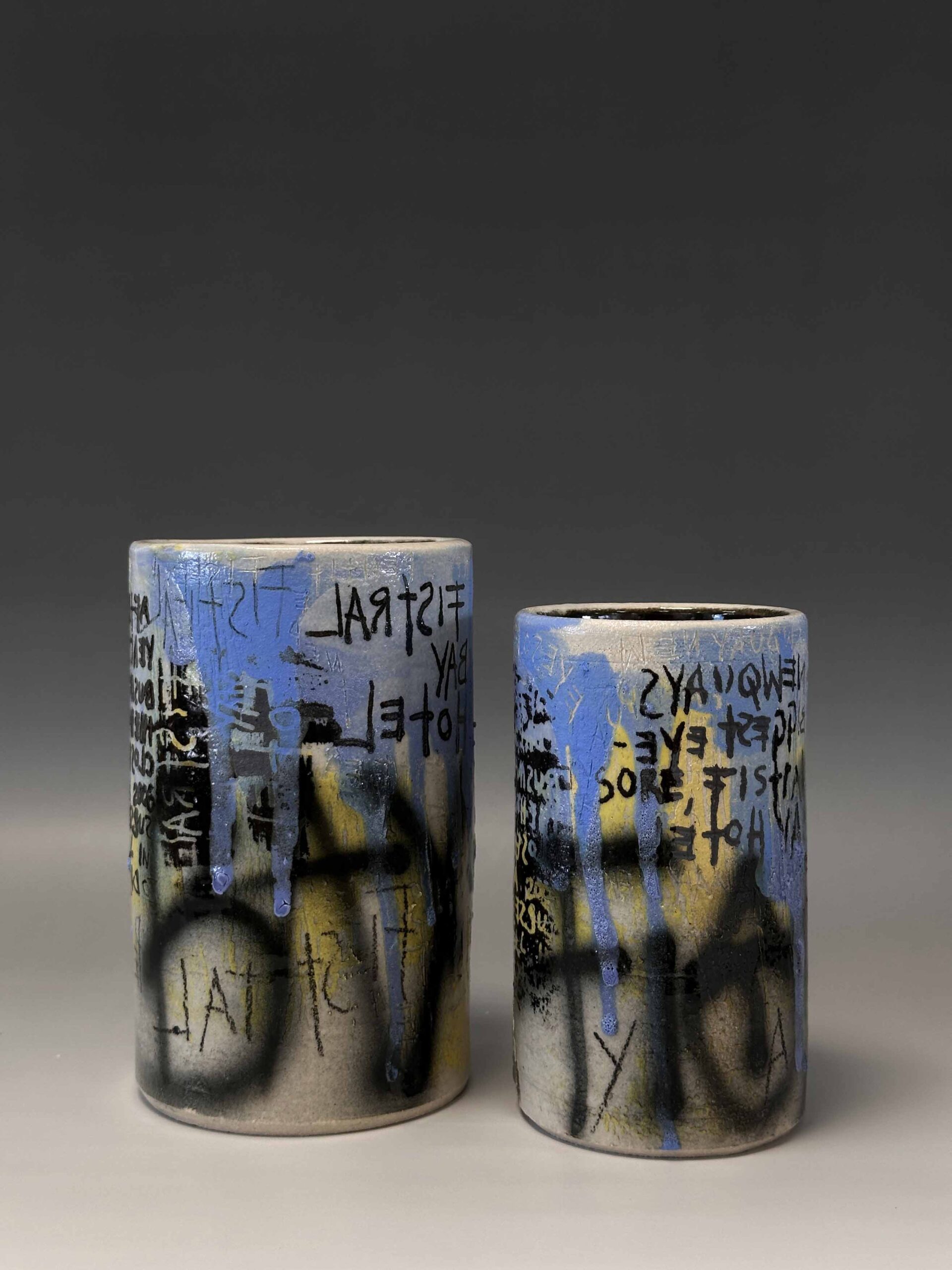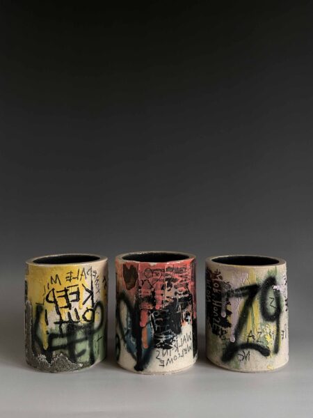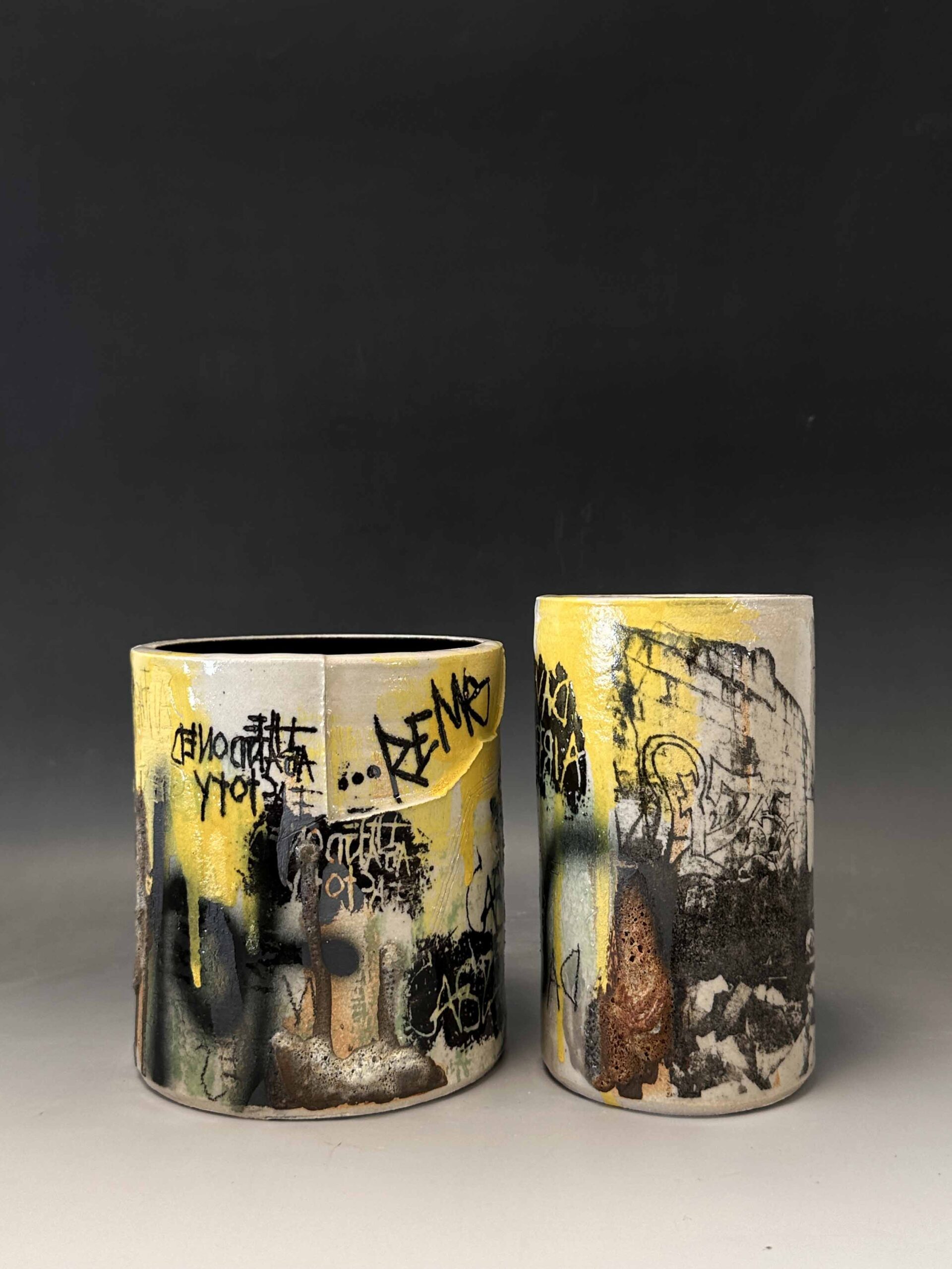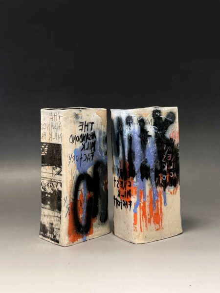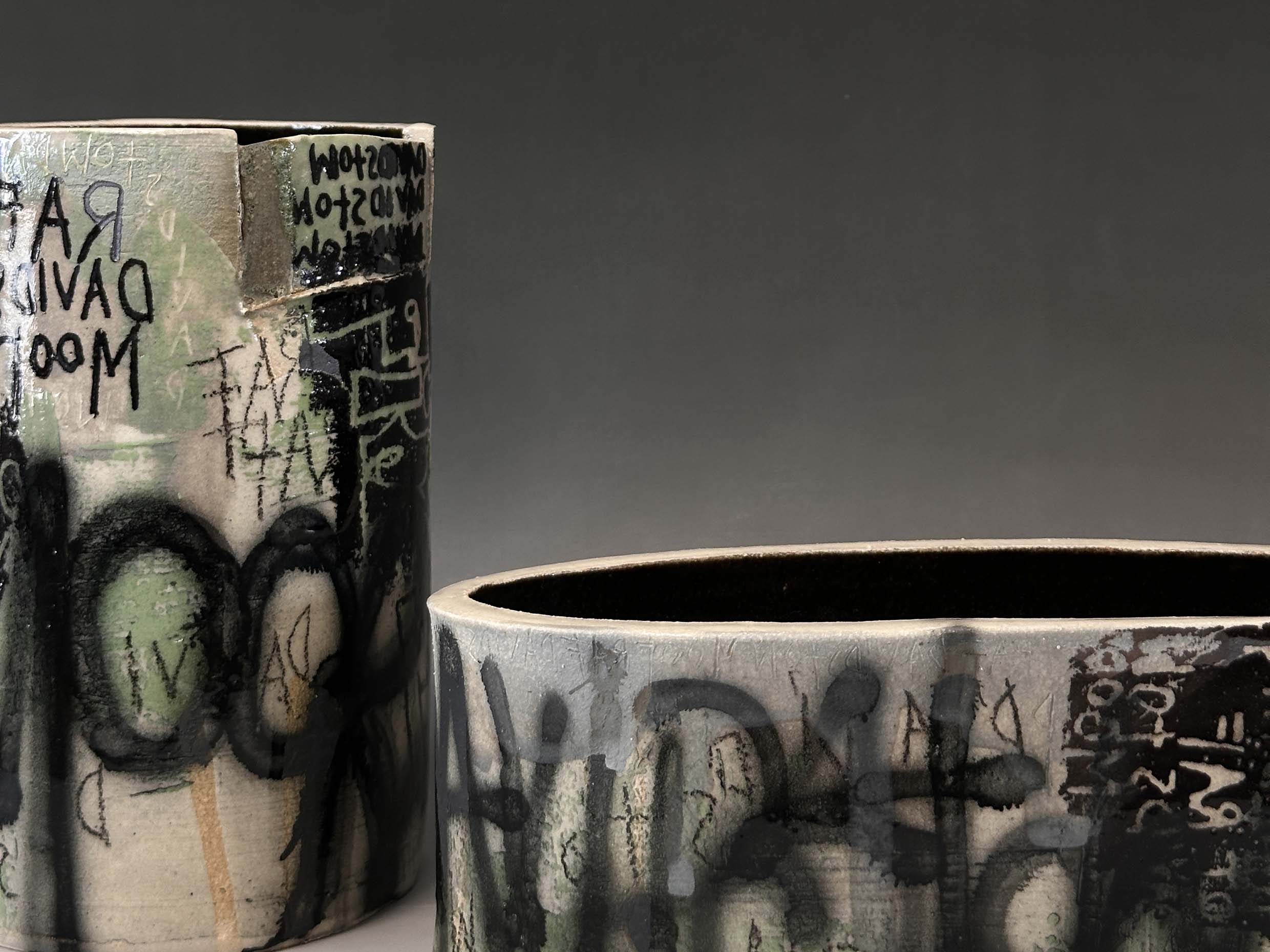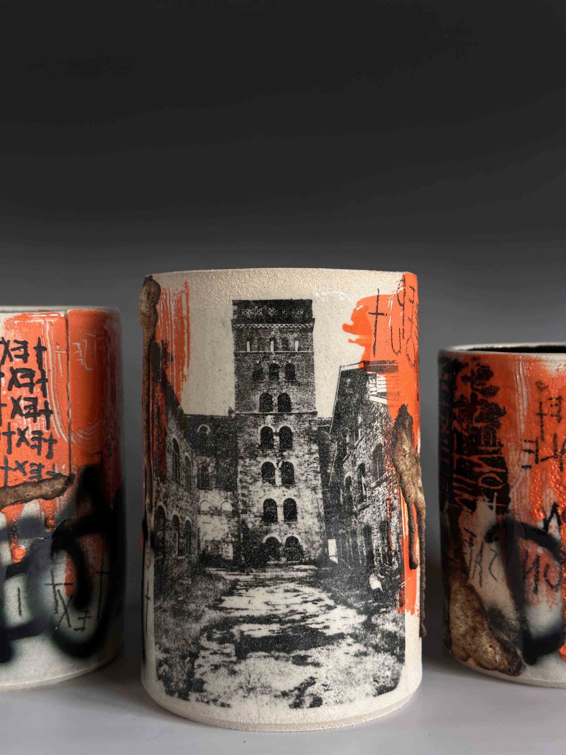 My practice is rooted in exploring the beauty of impermanence– my vessels become canvases for capturing the weathering of time, built up through multiple layers of slips, underglaze, volcanic glaze, sgraffito, monoprint, and photolithographic transfers that echo the graffiti covered walls of derelict buildings. The photolithographic transfers serve to capture fleeting moments in time, immortalising the fragile states of the buildings, and preserving their transient nature. Through this process, I invite reflection on the beauty of decay, the interplay between intentionally crafted and spontaneous deterioration, and the stories that the fragile surfaces hold.