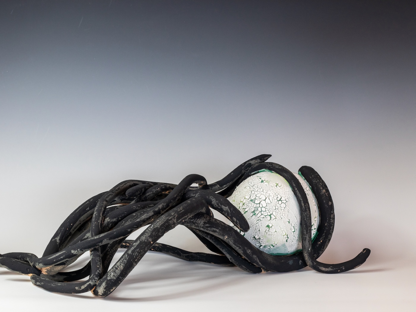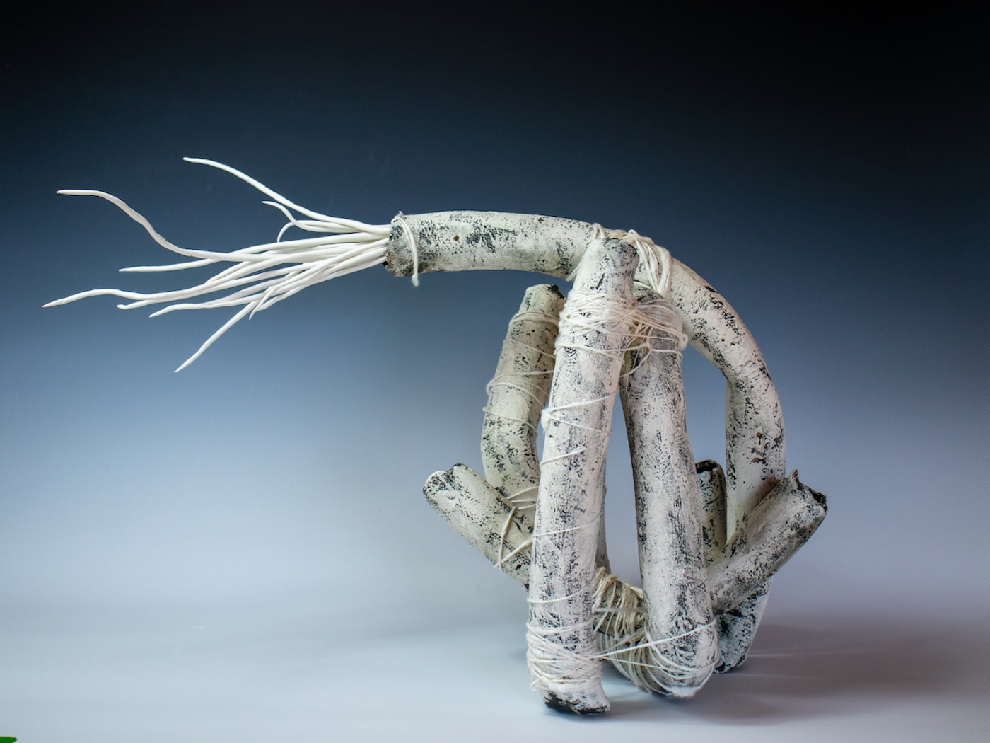 I am a ceramic artist living and working on Dartmoor, where the landscapes – ancient woodlands, weathered granite and hidden infrastructures shape my practice. Through sculptural ceramics, I explore the unseen systems that connect and sustain life, from mycelial networks beneath our feet to fibre-optic cables beneath the sea.